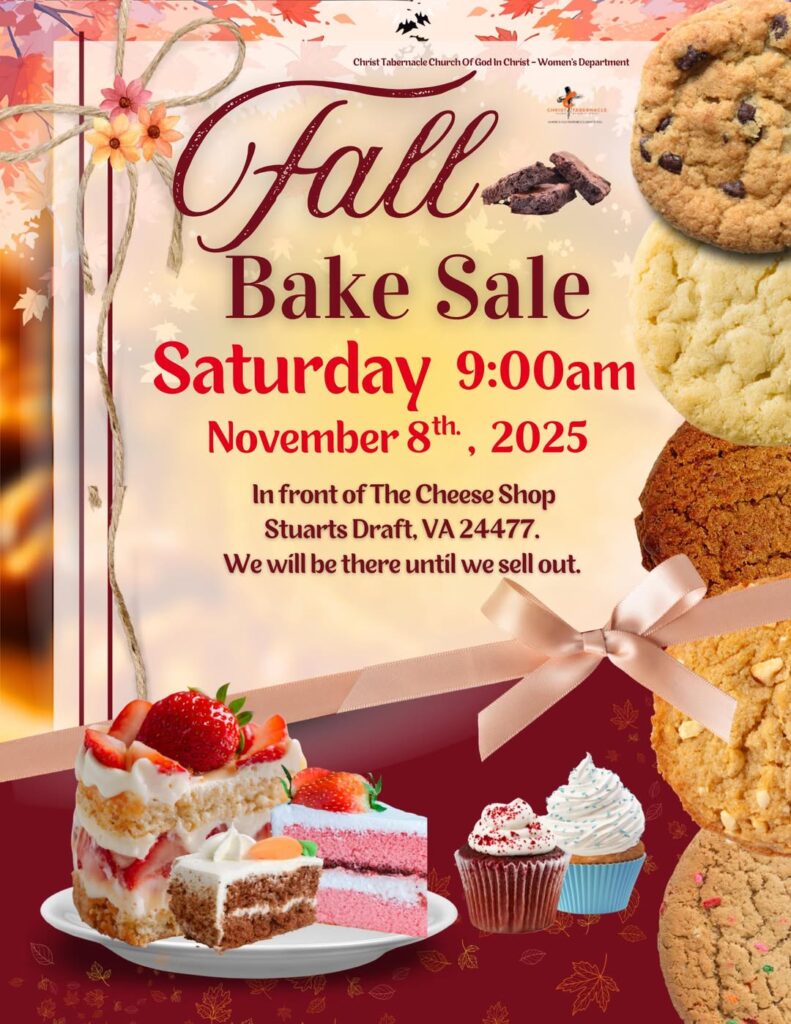 I hope you bring your appetite! The Christ Tabernacle Church of God in Christ Women’s Department will be hosting the “Fall Bake Sale” on November 8, 2025 at 9:00am. Come and support. We look forward to seeing you there!