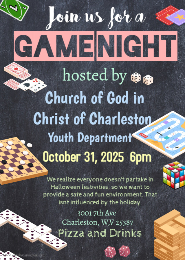 Not everyone takes part in Halloween festivities on October 31 but we want to offer a safe and fun environment all that can attend. Join us October 31st, 2025 @ 6:00pm for “Game Night” at Church of God in Christ of Charleston. We will have Games, FOOD and as always Praise so come see us!